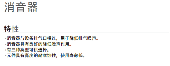 消音器與設(shè)備排氣口相連,用于降低排氣噪聲;消音器具有良好的降低噪聲作用;有三種類型可供選擇;元件具有高度的耐腐蝕性,使用壽命長.