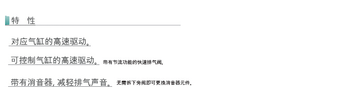 對應(yīng)氣缸的高速驅(qū)動, 可控制氣缸的高速驅(qū)動;帶有節(jié)流功能的快速排氣閥;帶有消音器,減輕排氣聲音;無需拆下旁閥即可更換消音器元件。