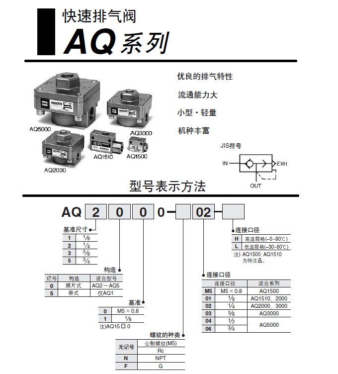 優(yōu)良的排氣特性;流通能力大;小型;輕量;機(jī)種豐富。