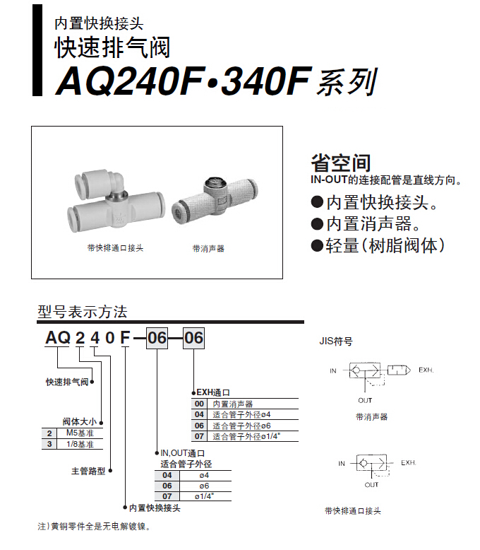省空間;IN-OUT的連接配管是直線方向;內(nèi)置快換接頭;內(nèi)置消聲器;輕量(樹脂閥體)。