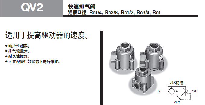 適用于提高驅(qū)動(dòng)器的速度,響應(yīng)性超群;排氣流量大;而才久性優(yōu)異;可在配管后的狀態(tài)下進(jìn)行維護(hù),連接口徑:Rc1/4、Rc3/8、Rc1/2、Rc3/4、Rc1。