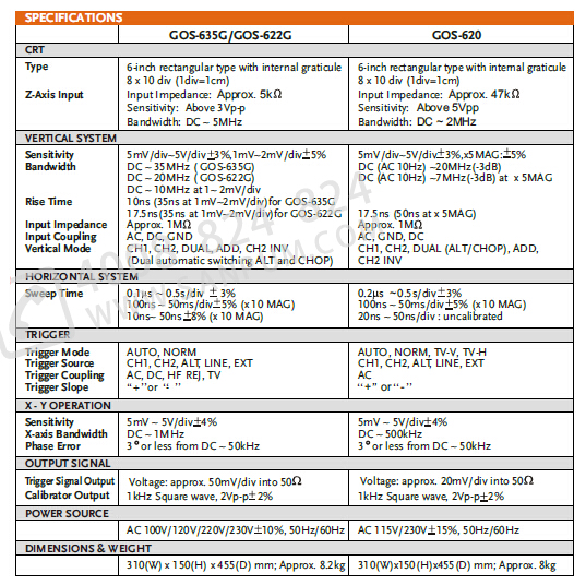20MHz帶寬, 雙通道(GOS-620)高靈敏度為1mV/div;TV同步,Z軸輸入;ALT觸發(fā)功能,CHI輸出.