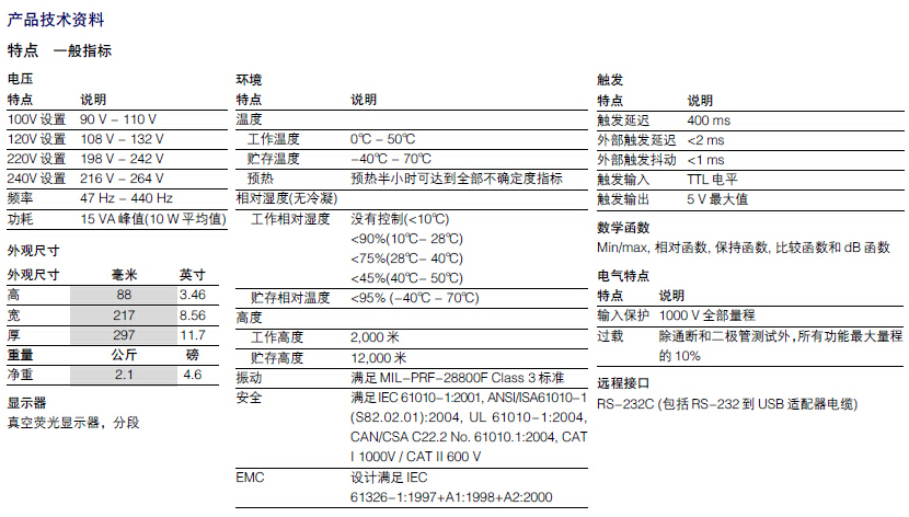 5.5位分辨率;高達0.015%的基本VDC準確度(1年);200mV- 1000V電壓量程,高達1μV分辨率;200μA-10A電流量程,高達1nA分辨率;200Ω -100MΩ電阻量程,高達1mΩ分辨率;CAT I 1000V, CAT II 600V;電壓、電阻和電流測量;二極管和通斷測試;頻率測量;2 x 4電阻4線測量技術(shù);專用DC泄漏電流測量;6個專用按鈕,快速進入儀器設(shè)置。