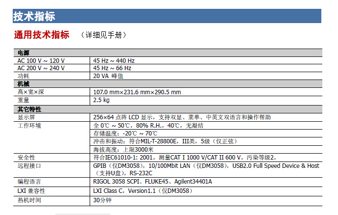 5? 位雙顯數(shù)字萬用表;高精度、多功能、 自動測量;高達123 rdgs/s的測量速度;真有效值交流電壓和交流電流測量;可快速存儲和調(diào)用10組預存配置;預設(shè)10種標準傳感器配置,內(nèi)置熱電偶冷端補償;簡單、方便、靈活的UltraSensor任意傳感器測量控制軟件;標準配置接口: USB Device,USB Host,LAN(ttDM3058),RS-232,GPIB(? DM3058);支持遠程命令控制。