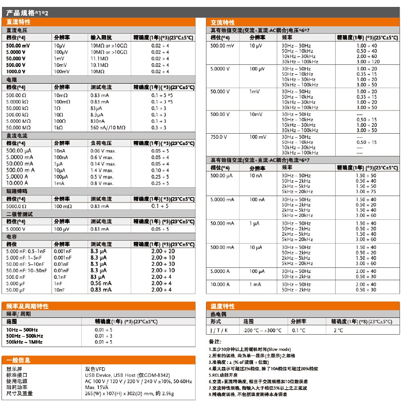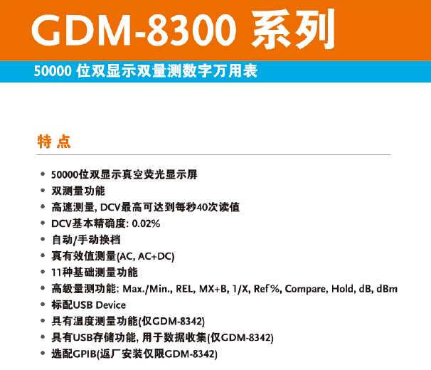 50000位雙顯示真空熒光顯示屏;雙測量功能;高速測量,DCV最高可達到每秒40次讀值;DCV基本精確度:0.02%;自動/手動換檔;真有效值測量(AC,AC+DC);11種基礎(chǔ)測量功能;高級量測功能:Max./Min., REL,MX+B, 1/X, Ref%,Compare, Hold, dB,dBm;標(biāo)配USB Device;具有溫度測量功能(僅GDM-8342);具有USB存儲功能,用于數(shù)據(jù)收集(僅GDM-8342)。