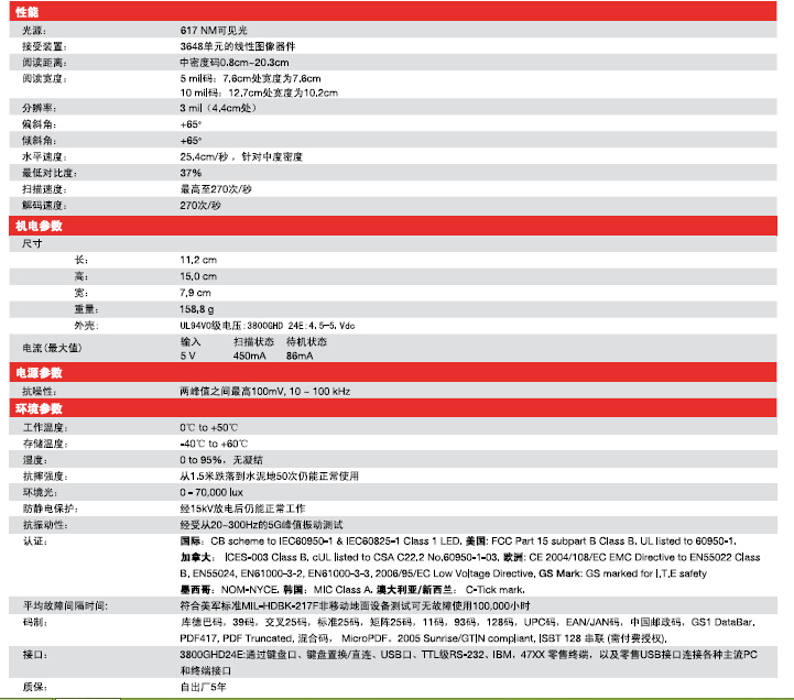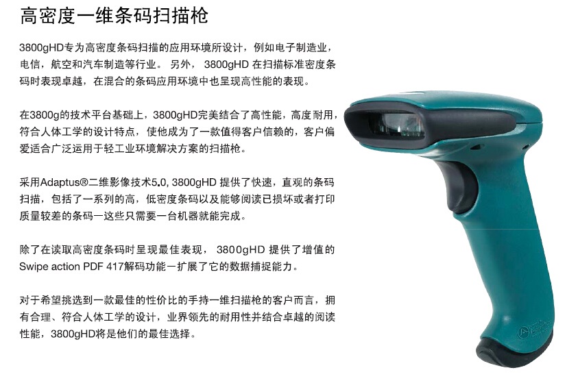 3800gHD專為高密度條碼掃描的應(yīng)用環(huán)境所設(shè)計(jì),其完美結(jié)合了高性能,高度耐用,符合人體工學(xué)的設(shè)計(jì)特點(diǎn),使他成為了一款客戶信賴的,客戶偏愛適合廣泛運(yùn)用于輕工業(yè)環(huán)境解決方案的掃描槍.