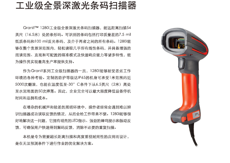 Granit1280i工業(yè)級全景深激光條碼掃描器,能遠距離掃描54英尺(16.5米)處的條形碼.可識別的條碼包括打印質(zhì)量差的7.5mil紙質(zhì)條碼和100mil反光條碼,及介于兩者之間的所有條碼.并具備增強的閱讀范圍、直觀和可配置的瞄準模式及快速響應(yīng)能力等諸多特性,能為操作員實現(xiàn)最高生產(chǎn)率提供支持.