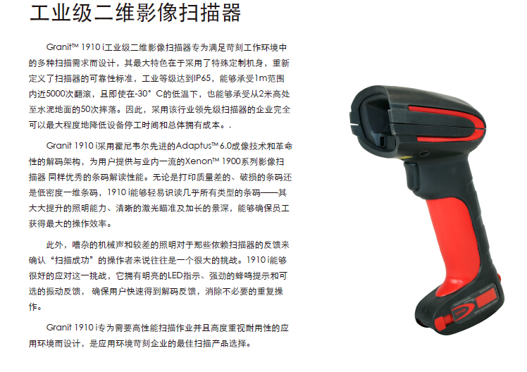Granit1910i工業(yè)級二維影像掃描器專為滿足苛刻工作環(huán)境中的多種掃描需求而設計,其最大特色在于采用了特殊定制機身,重新定義了掃描器的可靠性標準,是應用環(huán)境苛刻企業(yè)的最佳掃描產品選擇.