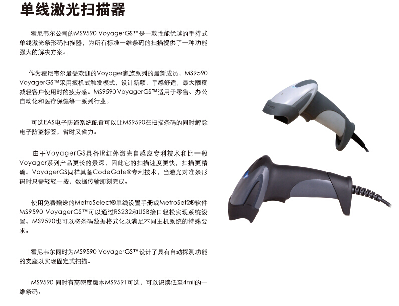 MS9590 VoyagerGS采用扳機(jī)式觸發(fā)模式,設(shè)計(jì)新穎,手感舒適,最大限度減輕客戶使用時(shí)的疲勞感.MS9590 VoyagerGS適用于零售、辦公自動(dòng)化和醫(yī)療保健等一系列行業(yè)
