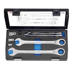 帶轉(zhuǎn)換頭用于1/4",3/8"和1/2"四方驅(qū)動(dòng)以及1/4"旋具頭,塑料盒裝,尺寸:275x150x42mm,包含7R 10、13、17、19/ 7RA-6,3、-10、-12,5/ 7RB-6,3.