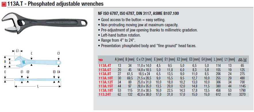 ISO 6787,DIN 3117,NF 374-324-ASME B107.8M標準.把手輪廓確保使用簡易.旋轉(zhuǎn)螺紋更順暢.鉗口坡度設(shè)計,增加可及性.顎部移至最大處無突出.毫米刻度,可預(yù)調(diào)整顎部開口.左邊旋轉(zhuǎn),尺寸:4-24.發(fā)黑主體,光滑開口,頭部拋光表面.