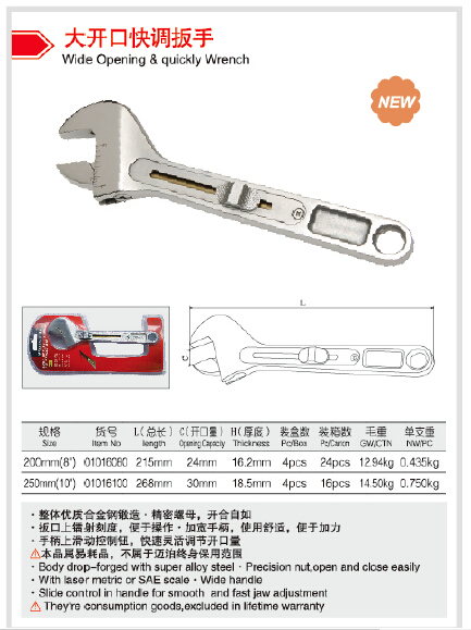 整體優(yōu)質(zhì)合鋼金鍛造,精密螺母,開合自如.扳口上鐳射刻度,便于操作,加寬手柄,使用舒適,便于加力,手柄上滑動(dòng)控制鈕,快速靈活調(diào)節(jié)開口量.本產(chǎn)品屬易耗品,不在邁泊終身保用范圍.