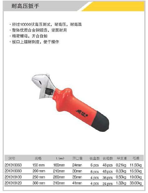 經(jīng)過10000伏高壓測試,耐高壓,耐高溫,整體優(yōu)質(zhì)合金鋼鍛造,堅固耐用,精密螺母,開合自如,扳口上鐳射刻度,便于操作.